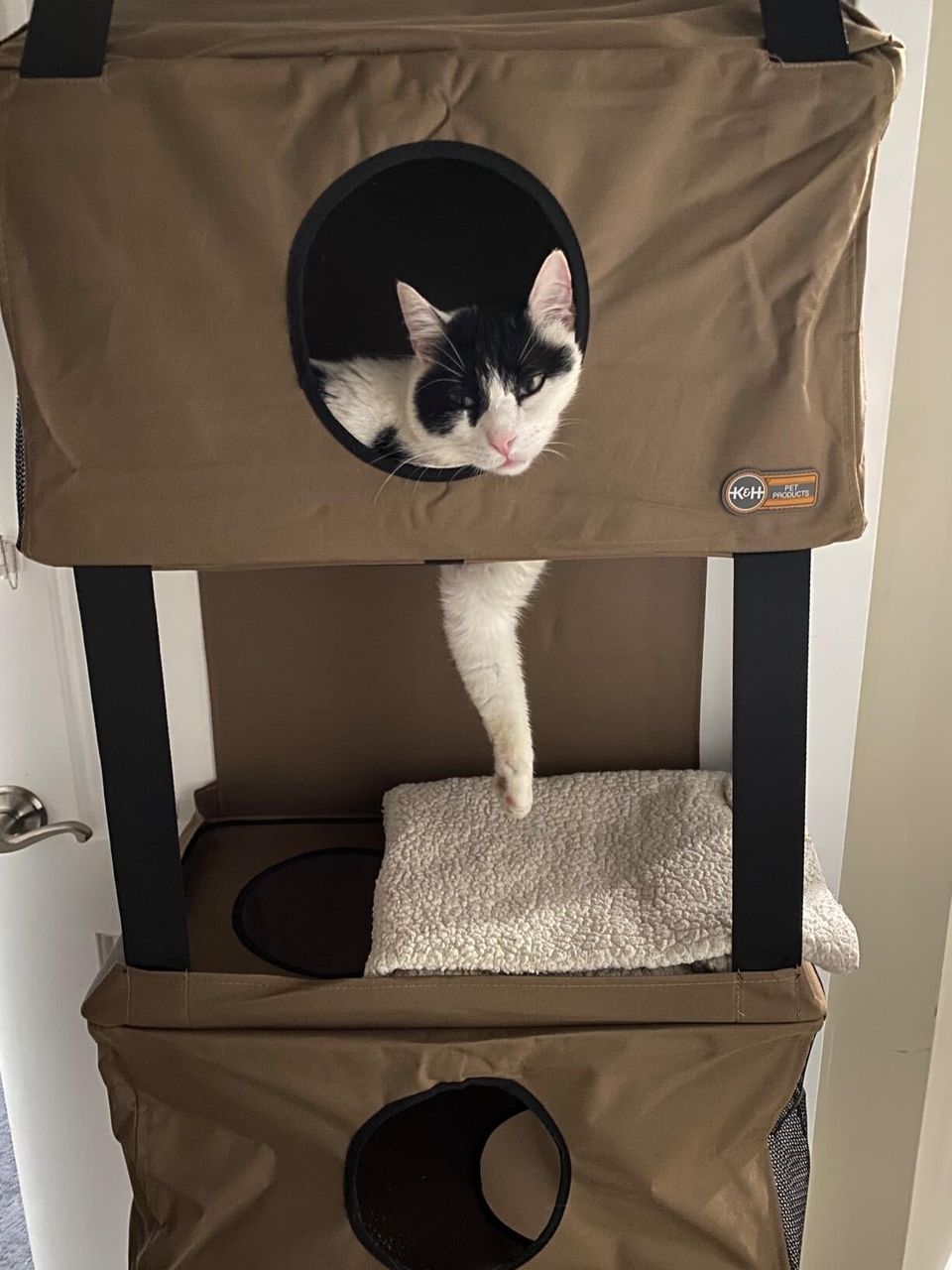 “I originally bought this 1.5 years ago because I wanted to give my kitty more space in our micro apartment and create a sort of ladder to the loft. It has since traveled around the country with the kitty and myself. It packs well during a move, is very simple to set up, and provides a nice, high, cozy place for her to watch the apartment from. I feel that this was the best thing I’ve gotten for her. I bought the small version because my kitty is small. At one point we lived with another, very large (16-pound) cat who had trouble fitting into the kitty condo and could only fit in the bottom floor.” — Rae-O