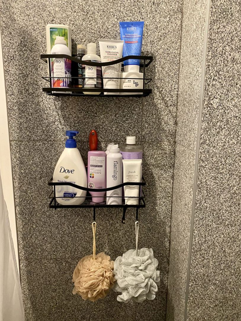 A set of two traceless adhesive shelves for your bathroom or kitchen