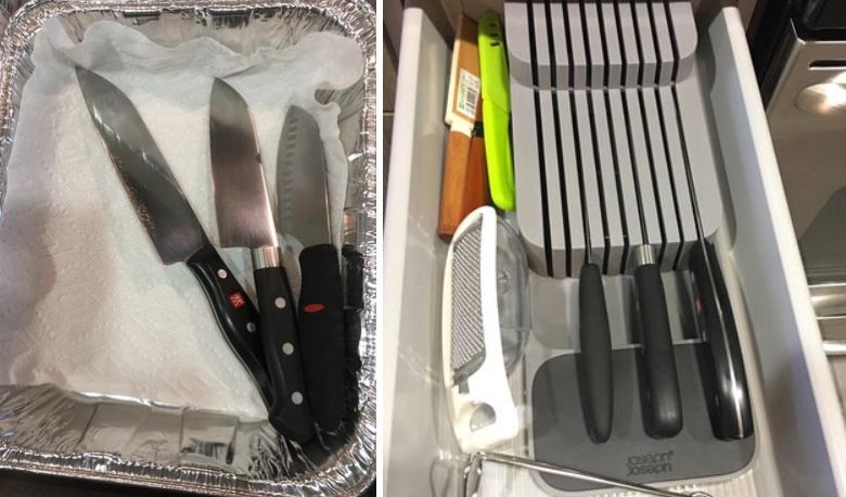 A two-tier knife organizer that holds up to nine knives